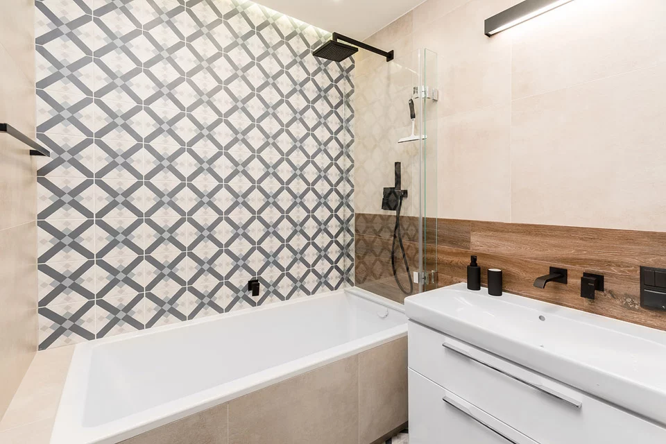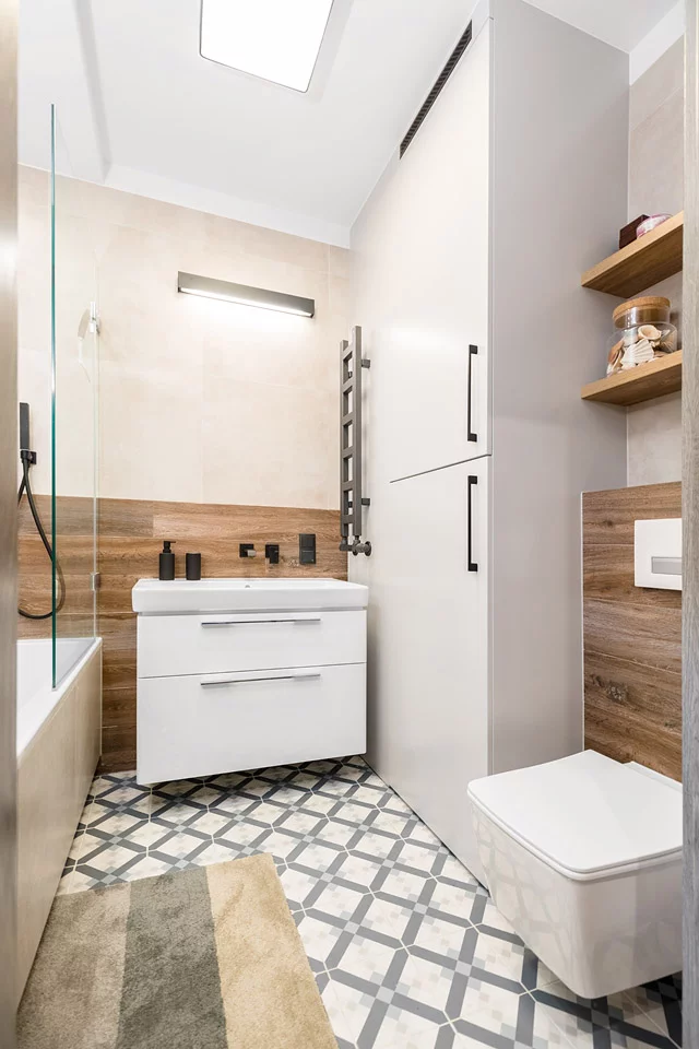 W łazience postawiliśmy na spójność z resztą apartamentu. Zastosowaliśmy tu:
